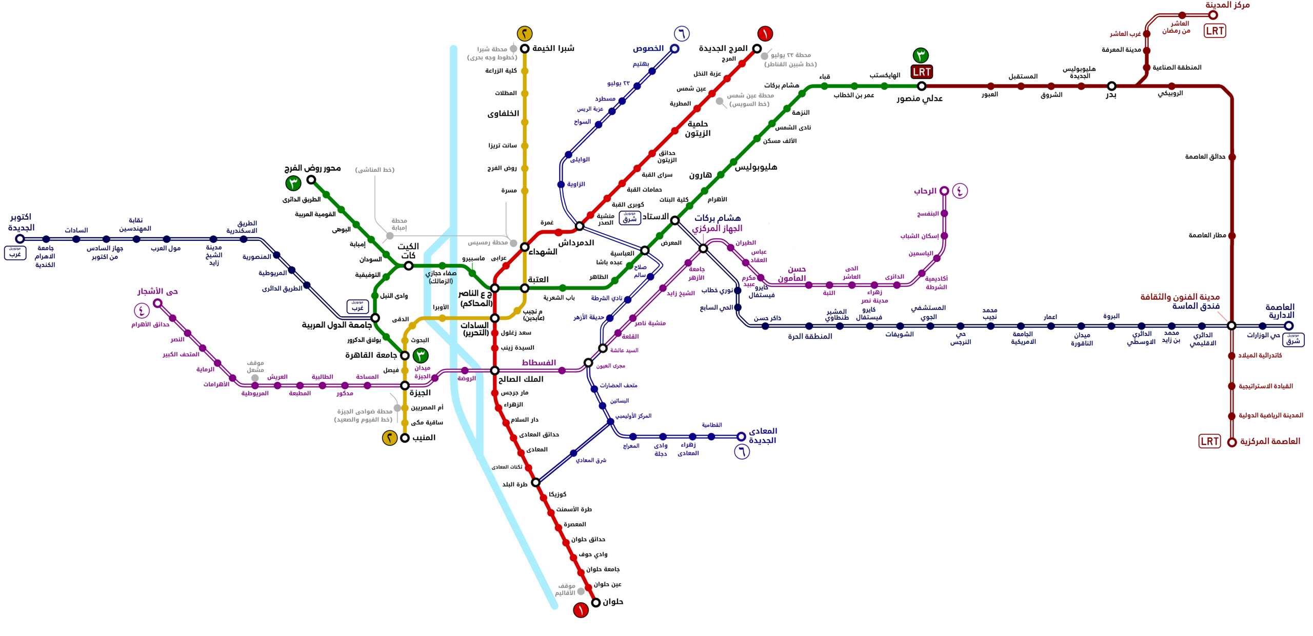 Cairo's newest transit additions. The LRT connects to the New Administrative Capital - Egypt's ambitious new governmental hub. The Monorail serves New Cairo and 6th of October City.